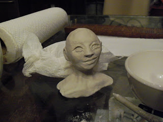 This morning I awakened to put cloth over a clay head I'd made with a bust